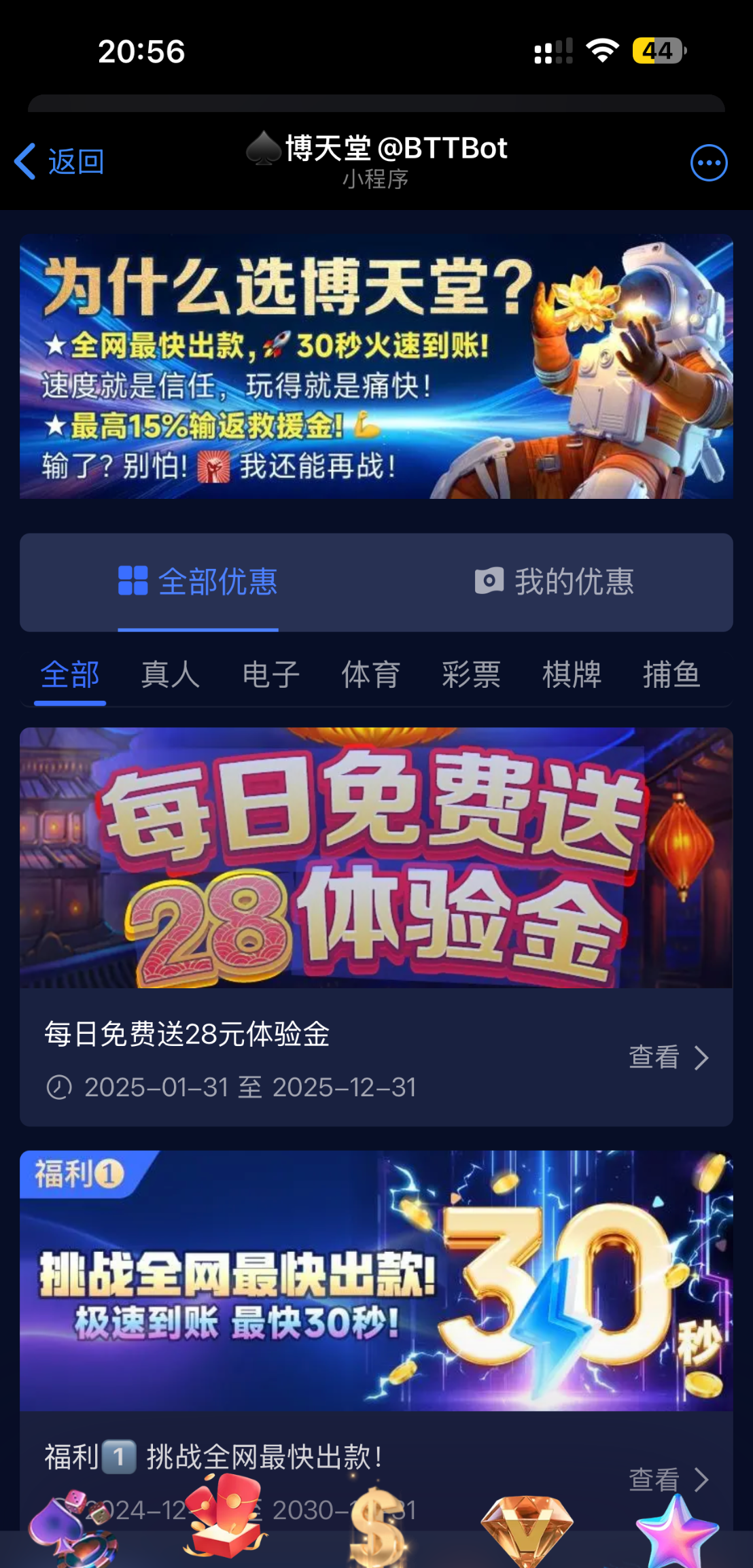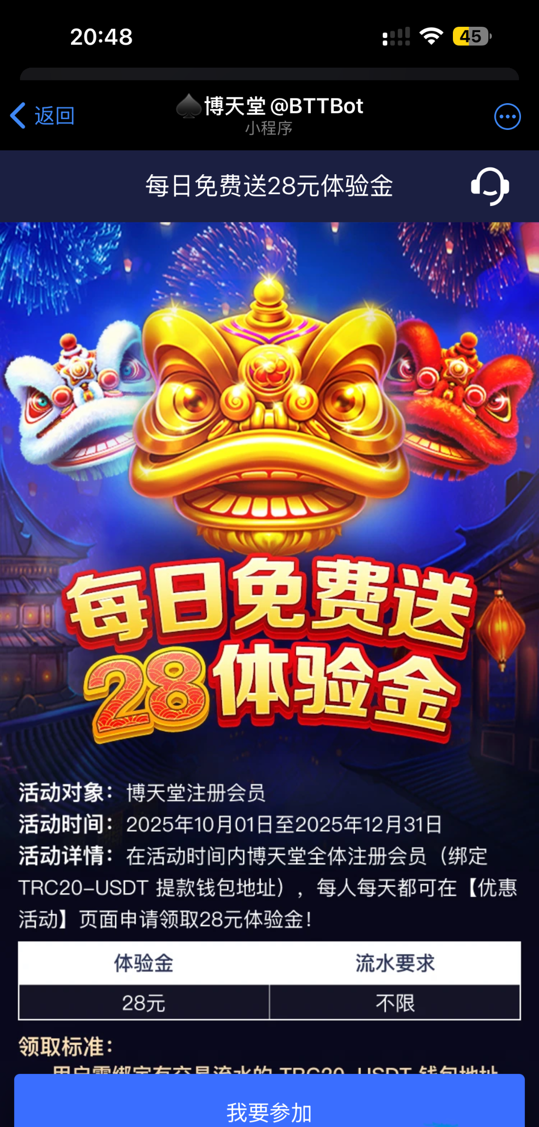 添加博天堂机器人飞机加@BTTBot 注册好之后点优惠直接点参加就可以了